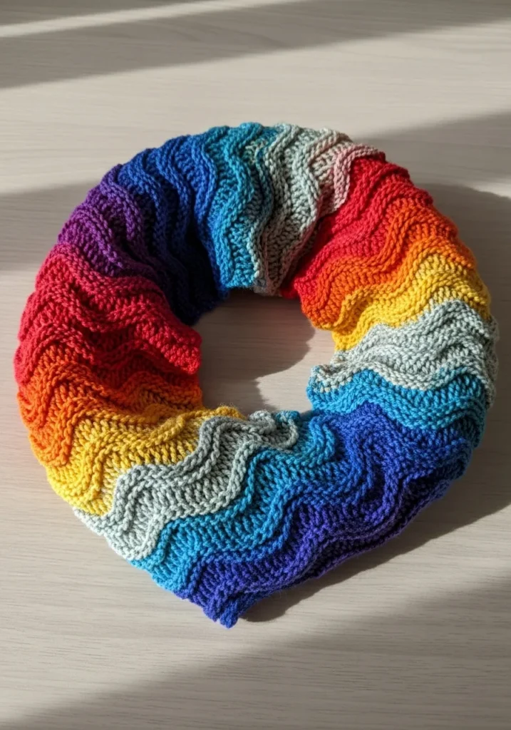 This circular cowl features a full spectrum of colors flowing from deep purple to bright red in a soft ripple pattern. The wavy texture adds movement and dimension, and each color stripe blends beautifully into the next while keeping the stitches defined and tidy. The fabric looks plush and stretchy, with consistent ridges that give it structure without feeling stiff.