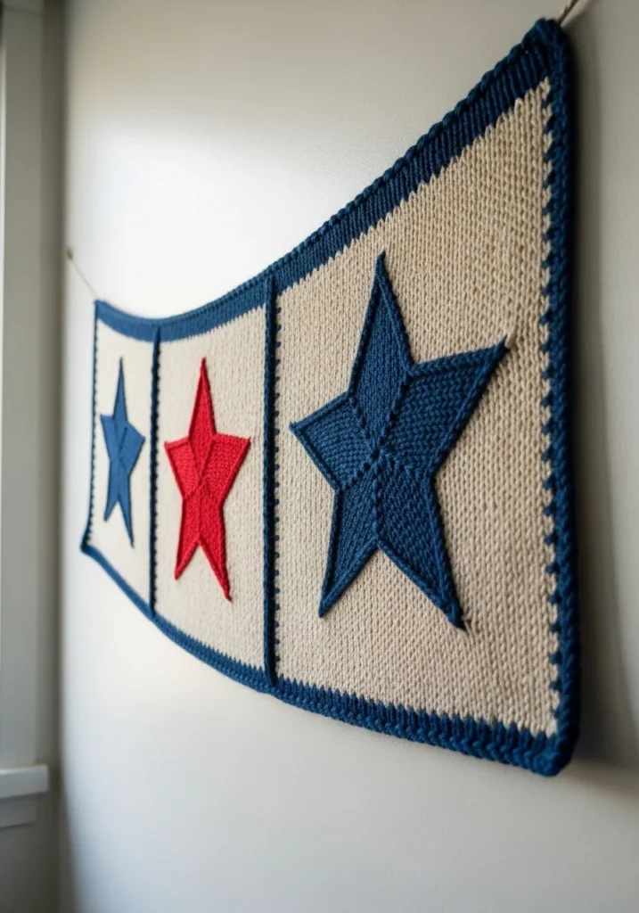 This rectangular wall hanging features three large star motifs in blue and red set against a creamy background with a deep navy border. Each star is sharply defined with raised texture that stands out from the flat knit base, and the edges are finished neatly so the piece hangs straight and structured. The color contrast feels classic and graphic, making it a statement decor piece.