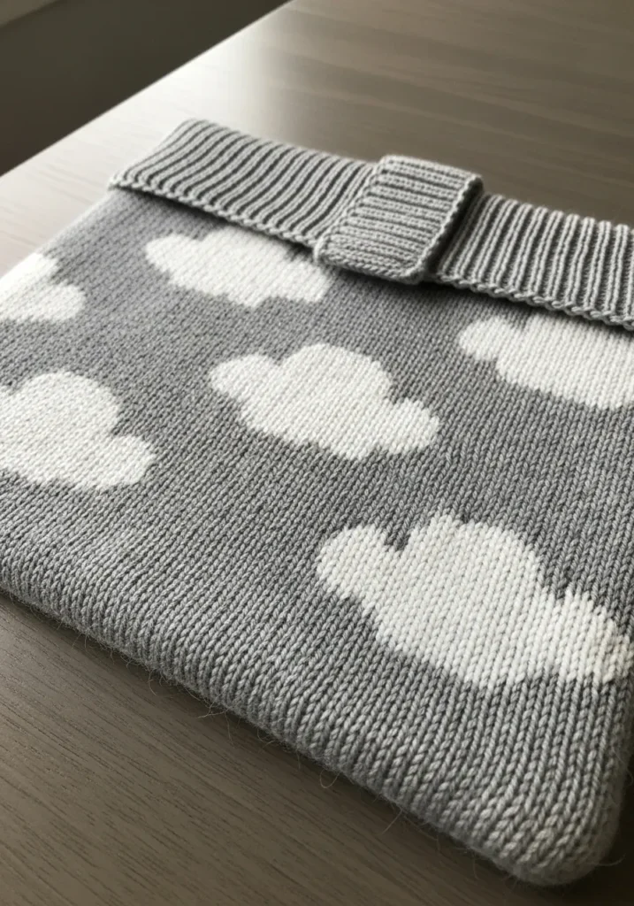 This soft grey sleeve is decorated with fluffy white cloud motifs scattered evenly across the surface. The top flap folds over neatly and is secured with a wide knitted strap, creating a clean and minimal silhouette. The stitches are uniform and dense, giving the sleeve structure while still feeling cozy and protective.