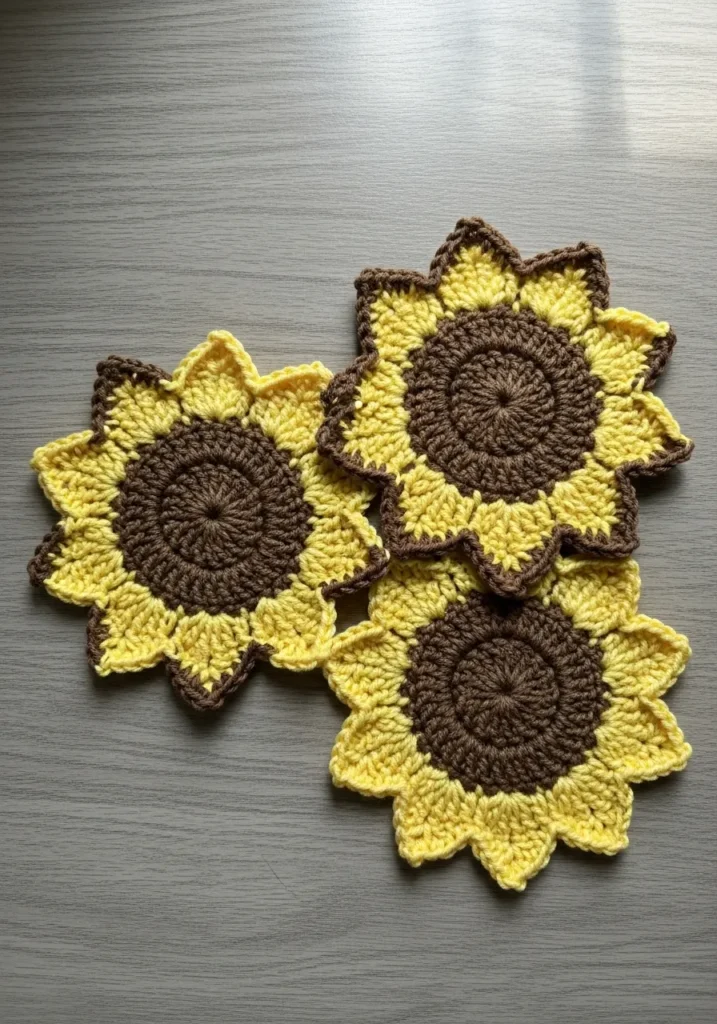 These cheerful coasters are shaped like sunflowers with rich brown centers and bright yellow petals edged in a slightly darker outline. The circular centers are tightly stitched, while the petals flare outward with textured definition that gives each flower depth. The yarn looks thick and absorbent, making them both decorative and practical.