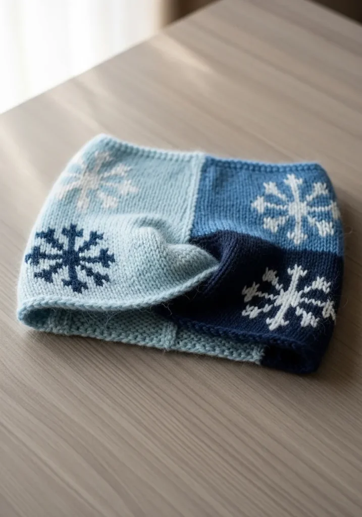 This cozy headband combines light blue, navy, and icy white panels with crisp snowflake motifs worked neatly into each section. The front twist detail adds shape and dimension, while the edges lie flat and smooth against the surface. The color blocks are balanced and clean, giving the whole piece a tidy winter ready look.