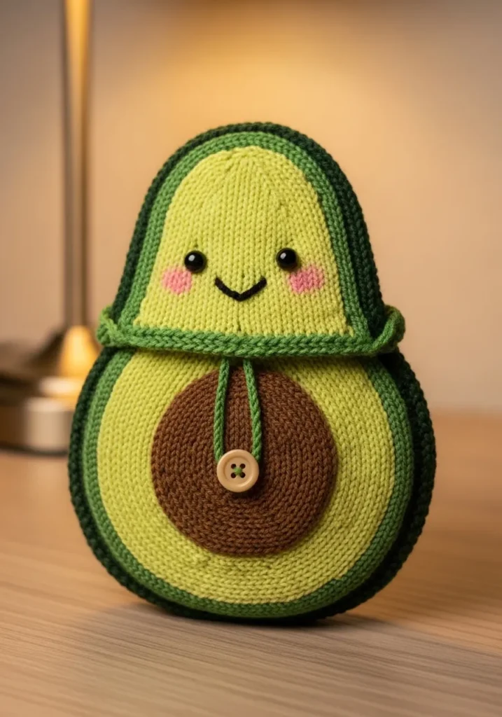 This adorable avocado plush is knitted in layered greens with a rich brown center and tiny embroidered smile and rosy cheeks. The outer edge forms a rounded border that frames the lighter inner section beautifully, and a simple button detail adds charm and dimension. The shaping is smooth and symmetrical, giving it a soft sculpted look.