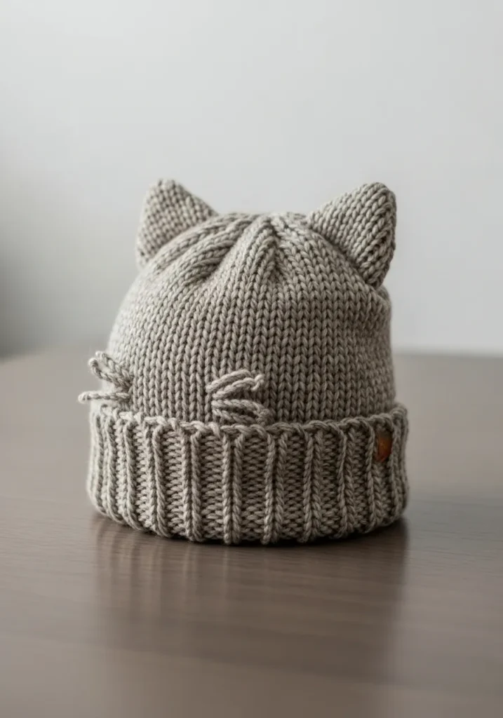 This soft neutral beanie is knitted in a light oatmeal yarn with a smooth stockinette body and a thick stretchy ribbed brim that hugs the head comfortably. The top is shaped into subtle cat ears that stand upright without looking stiff, and tiny whisker details stitched near the folded brim add a playful touch. The stitches are even and tidy, giving the whole hat a polished finish that looks boutique ready while still feeling cozy and handmade.