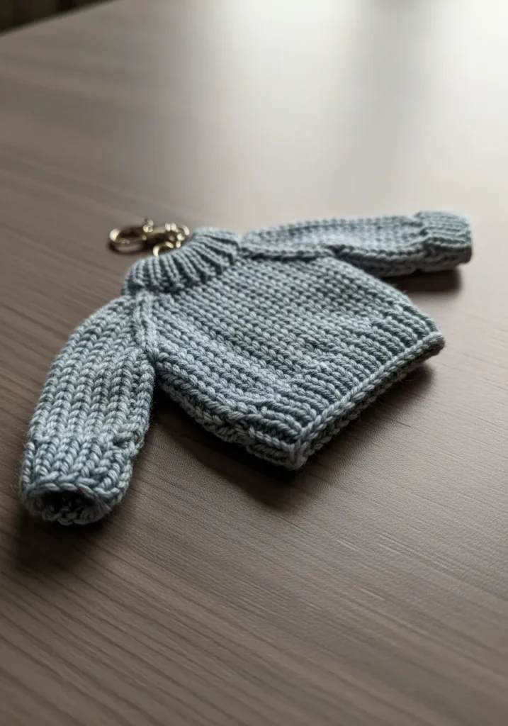 This tiny grey sweater keychain is worked in classic stockinette with ribbed cuffs and a snug ribbed neckline. The sleeves are shaped neatly and attached seamlessly, and the bottom hem lies flat with even stitch definition. Despite its small size, the structure looks crisp and balanced.