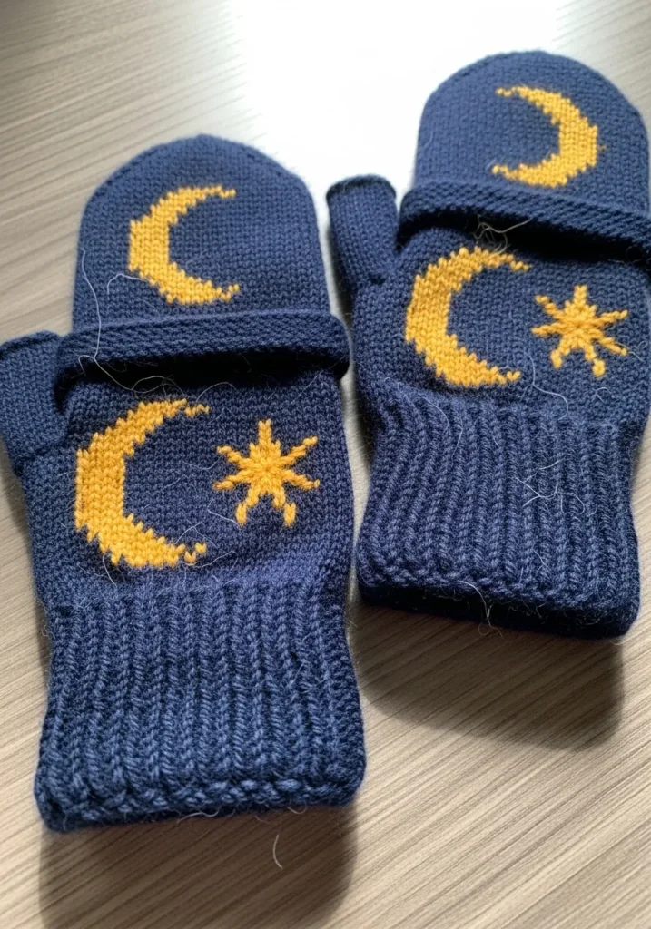 These deep navy mittens feature a bold golden crescent moon and star worked in smooth colorwork across the front. The cuffs are knitted in snug ribbing for a secure fit, and the folded tops create a layered look that feels extra warm and practical. The contrast between the dark background and bright motif makes the design pop beautifully while keeping the texture soft and flexible.