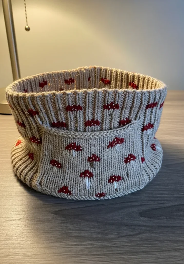 This chunky beige cowl is knitted with a ribbed texture and dotted with adorable red mushroom motifs scattered across the fabric. A flat front panel forms a subtle pocket that blends into the overall design while still being functional. The yarn looks plush and warm, and the structured ribbing helps the piece hold its shape while keeping it stretchy and comfortable.