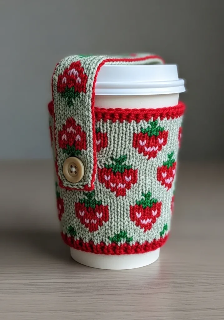 This knitted cup cozy wraps around a takeaway cup with a creamy base and bright red strawberry motifs scattered evenly across the surface. A matching red trim outlines the top and bottom edges, and a side strap with a wooden button keeps everything secure. The fabric looks snug and structured, making it both decorative and practical.