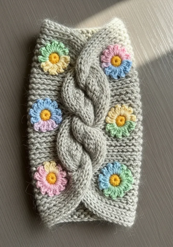This soft grey headband features a bold central cable that twists beautifully down the middle, framed by textured garter stitch panels. Scattered across the surface are sweet pastel daisy appliqués in soft pink, blue, yellow, and mint tones, adding dimension and charm. The piece looks stretchy yet structured, with clean edges that frame the braid perfectly.