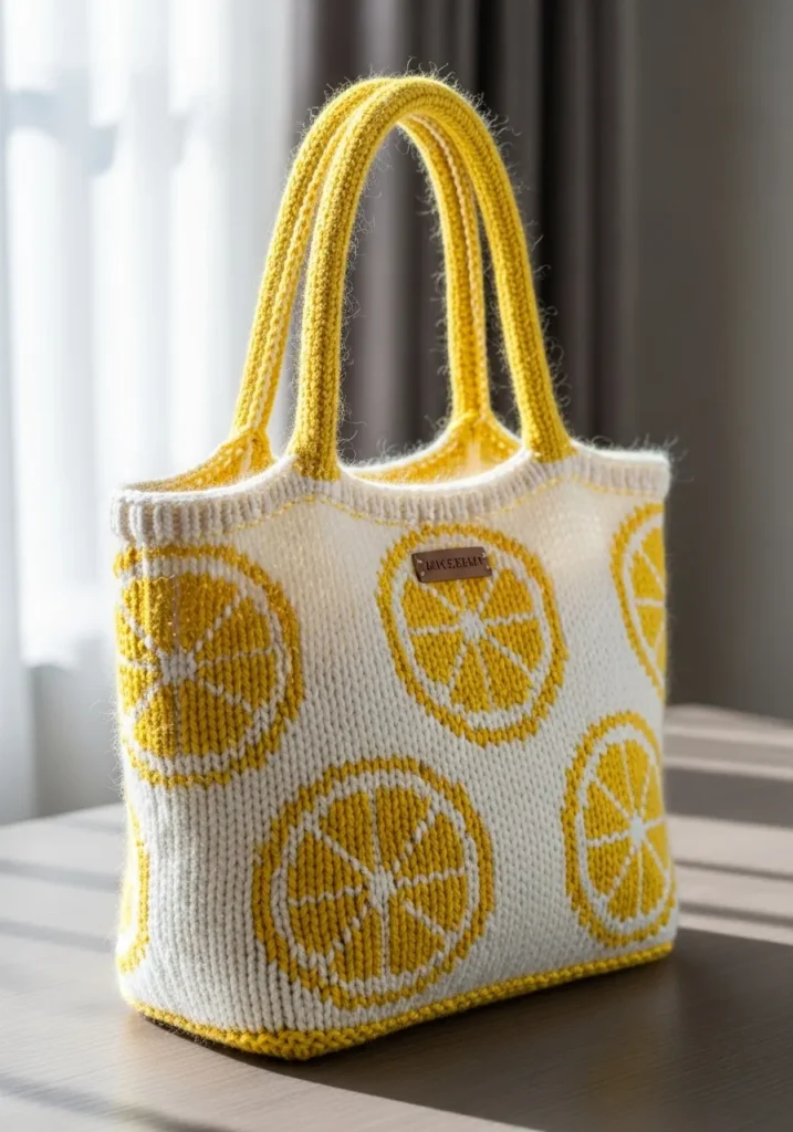 This structured tote bag features a creamy white base decorated with bold yellow lemon slice motifs evenly spaced across the surface. The handles are knitted in matching yellow for a coordinated look, and the edges are finished neatly so the bag keeps its shape. The stitches are smooth and consistent, giving the whole piece a bright and polished feel.
