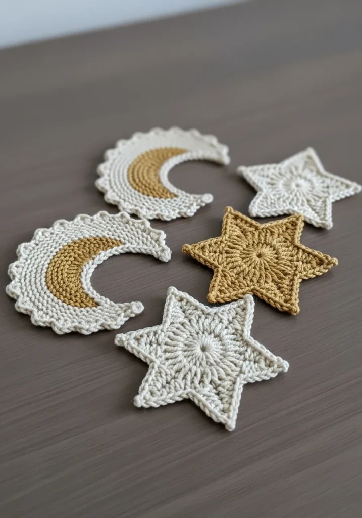 These delicate knit ornaments feature soft cream and warm beige yarn shaped into charming stars and crescent moons, each one finished with neat edging that gives them a slightly lacy texture. The stitches are tight and clean, creating a smooth surface with subtle dimension, and the neutral color palette makes them feel cozy and timeless. Small loops at the top turn them into ready to hang decorations, perfect for a nursery, holiday tree, or even as gift toppers that feel extra thoughtful.