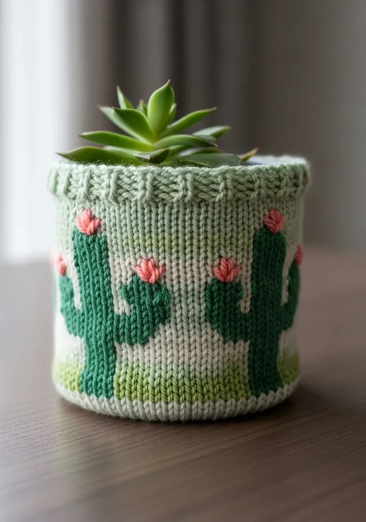 This tiny knit plant cozy wraps around a small pot with a soft green base and simple cactus motifs stitched in darker green with tiny pink blooms. The ribbed top edge adds stretch and texture, while the overall design feels cheerful and modern. The yarn appears medium weight, giving the cozy enough structure to hold its shape.