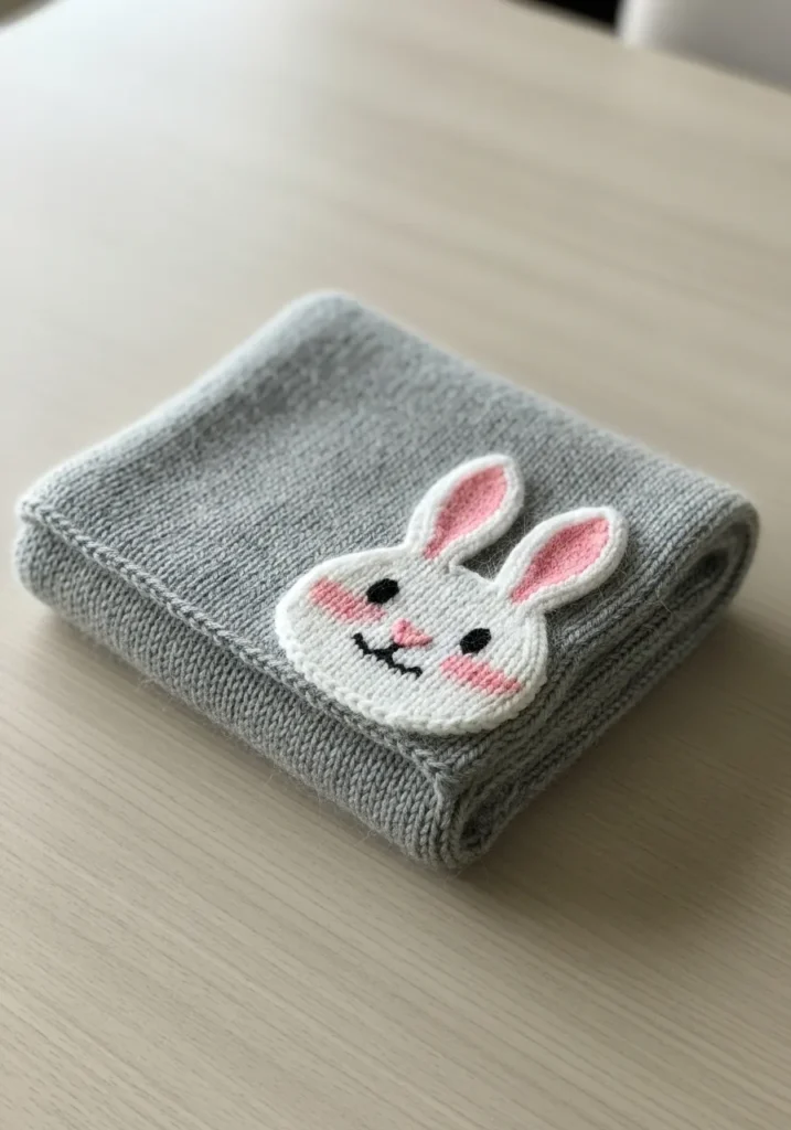 This soft gray knit baby blanket features a small pink and white bunny motif stitched near one corner. The fabric looks smooth and gentle, with a cozy texture that feels perfect for delicate skin. The pastel accents stand out subtly against the neutral background, keeping the overall design calm and sweet.