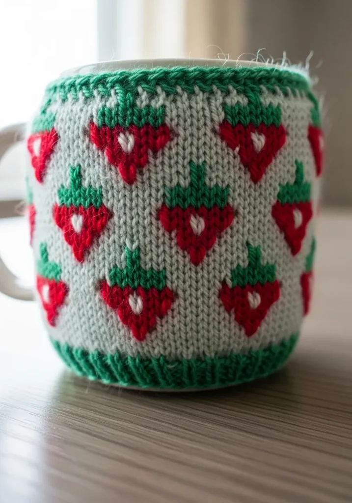 This cheerful mug cozy is knit in soft green and white yarn with bright red strawberries stitched all around in a playful repeating pattern. The fabric has a snug, stretchy texture that hugs a standard mug perfectly, and the colorwork adds a fun pop without feeling complicated. The smooth finish and neat edges give it that polished handmade look.