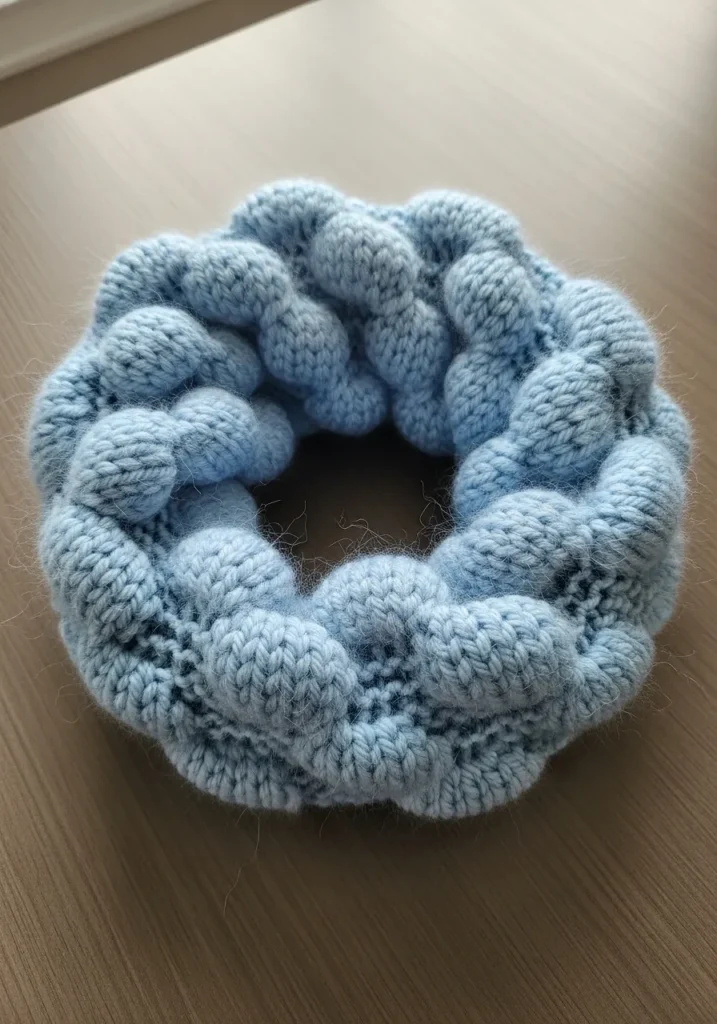 This fluffy sky blue scrunchie is knit with thick, plush yarn that creates a soft braided texture all the way around. The stitches are bold and pillowy, giving it a voluminous shape that looks almost like a chunky cable wrapped into a circle. The color is calm and pretty, and the overall design feels modern yet cozy.