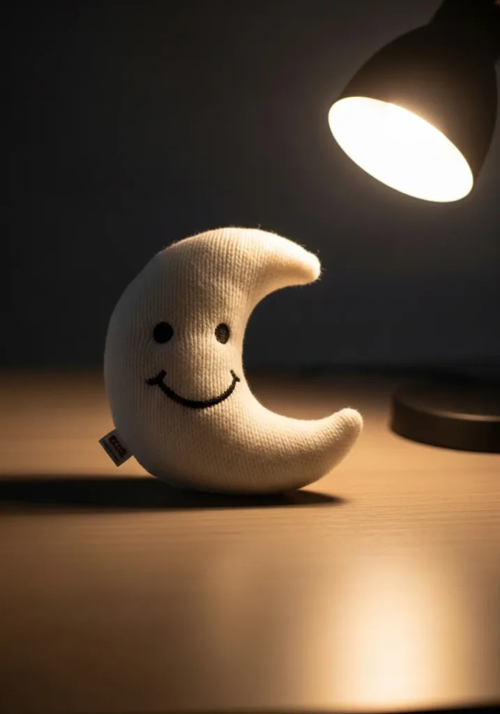This soft crescent moon is knit in a warm beige yarn with a smooth, stuffed texture that makes it look cuddly and sweet. The stitched eyes and curved smile give it a friendly expression, and the gentle shaping creates that perfect moon silhouette. It looks especially charming placed near a bedside lamp.