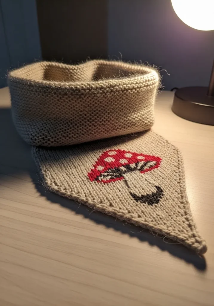 This neutral toned basket is knit with thicker yarn that creates a sturdy, slightly textured fabric. The simple stitch pattern keeps the sides structured, while the wide opening makes it practical for holding small items. Paired with a matching knit mat featuring a tiny red mushroom detail, the whole setup feels warm and handmade.