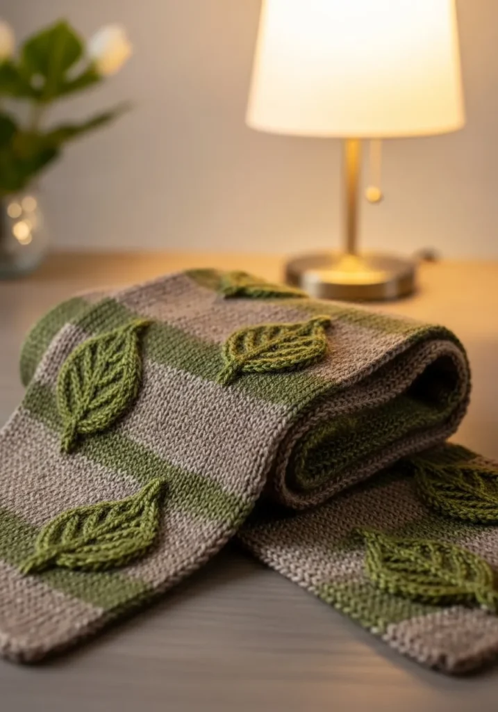 This soft knit throw is crafted in a muted taupe base with raised green leaf motifs stitched across the surface, giving it a beautiful textured look. The leaves stand out in a slightly thicker yarn, adding dimension and a touch of nature inspired charm. The fabric looks plush and warm, with a smooth knit background that contrasts gently against the sculpted leaf details, making it both decorative and functional.