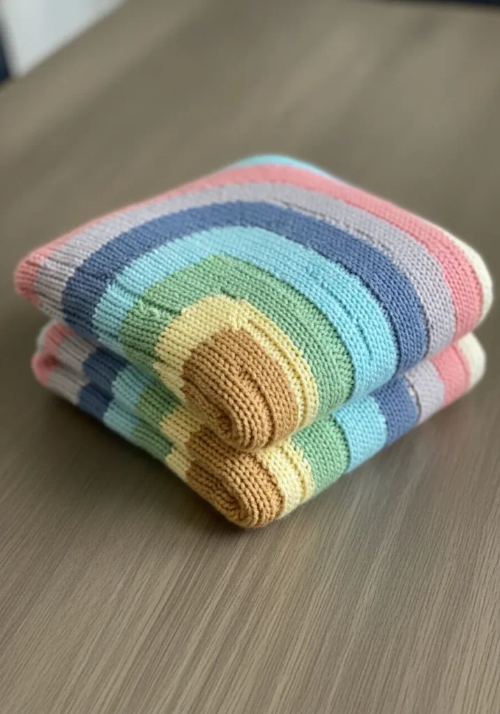 These neatly folded dishcloths are knit in soft pastel rainbow stripes that blend beautifully from one color to the next. The texture looks smooth and absorbent, with even stitches that create a flat, flexible fabric. The gentle color palette makes them feel cheerful without being too bold.