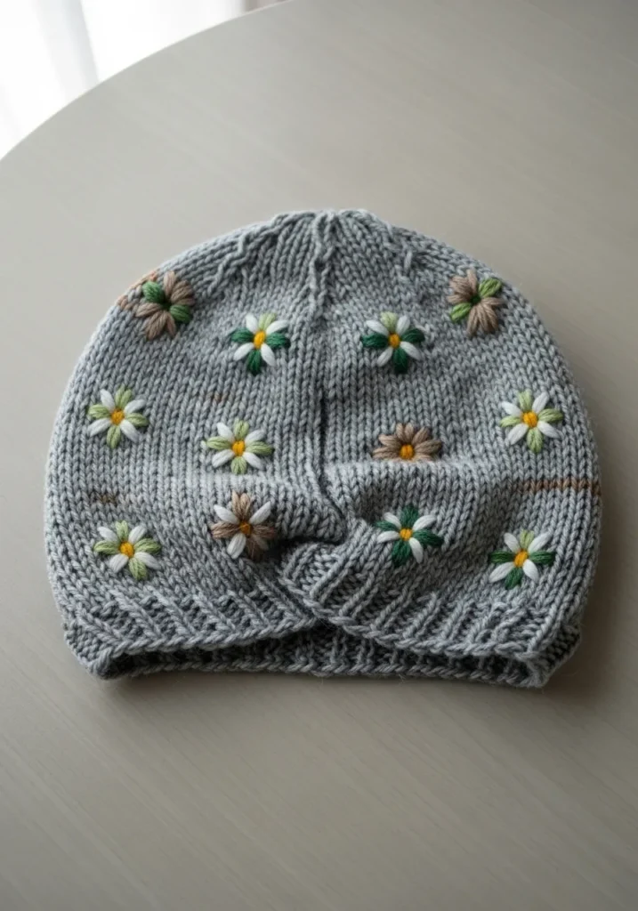 This soft gray knit beanie is sprinkled with tiny embroidered daisies in white and sunny yellow, giving it the sweetest handmade charm. The yarn looks medium weight with a cozy ribbed brim that hugs comfortably, while the crown is shaped smoothly for a relaxed everyday fit. Each little flower pops gently against the muted gray background, adding texture and a delicate handmade feel without overwhelming the design.