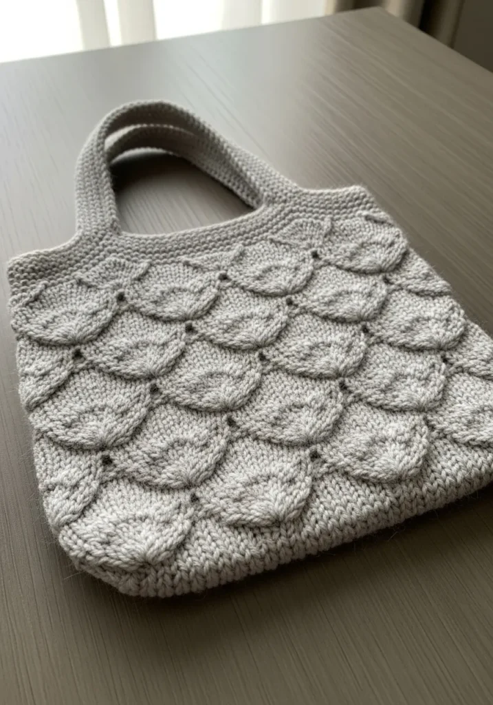 This structured knit handbag is made in a soft cream yarn with a beautiful scalloped texture that resembles overlapping shells. The repeating raised pattern adds depth and dimension, while the sturdy knit handles blend seamlessly into the body of the bag. The overall look is neutral, elegant, and slightly vintage inspired, yet still casual enough for everyday use.
