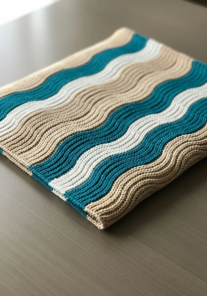 This knit blanket showcases soft wavy stripes in shades of teal, cream, and sandy beige, creating a gentle ripple effect across the fabric. The alternating colors give it a coastal feel, while the textured stitch pattern adds depth and movement. The yarn appears soft and medium weight, making the blanket drape nicely without feeling too heavy.