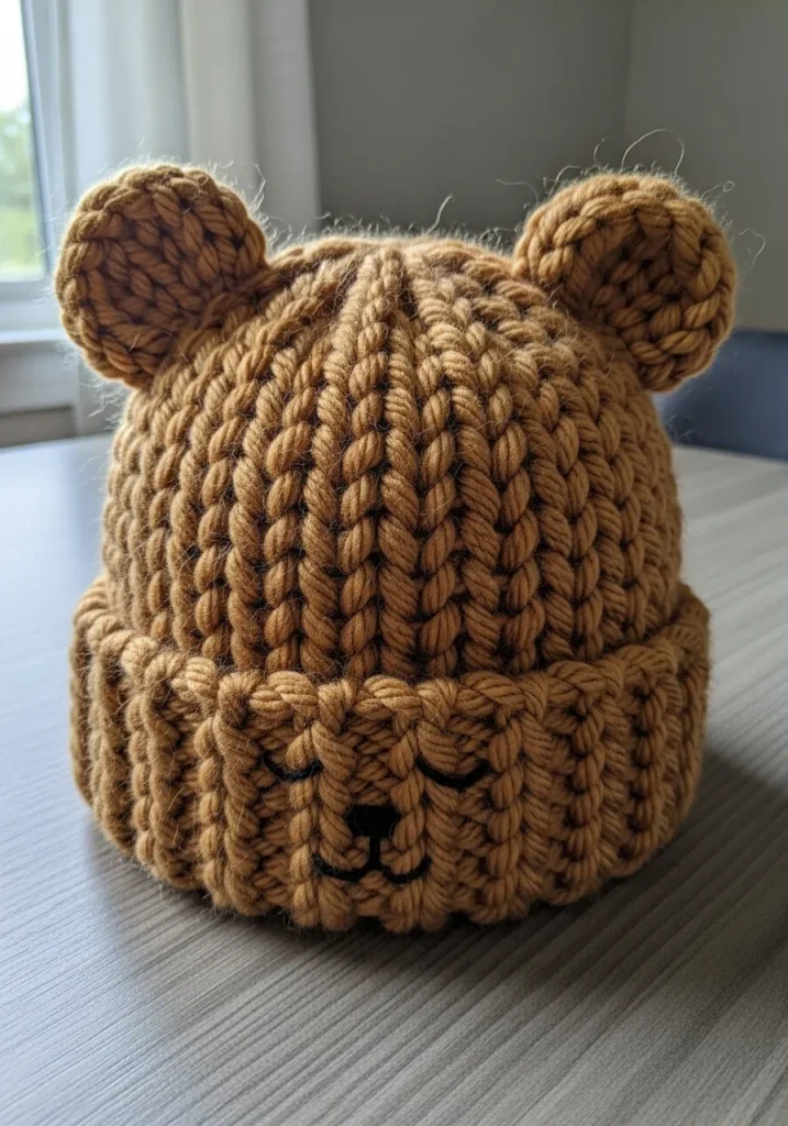 This chunky knit beanie is made from thick caramel brown yarn and shaped into a cozy hat with two rounded bear ears perched on top. The stitches are bold and oversized, showing off that beautiful squishy texture you only get from chunky yarn. The folded brim features a simple stitched bear face with sleepy eyes and a tiny nose, which gives it so much personality. The yarn has a soft halo and a few natural fuzzies that make it feel extra warm and handmade in the best way.