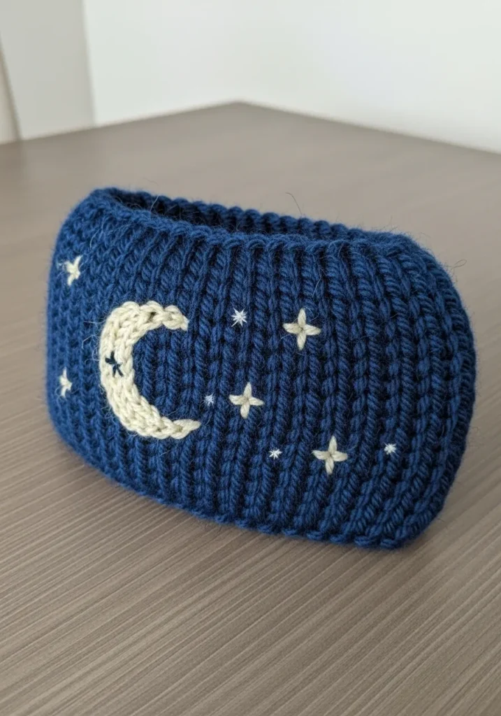 This chunky knit ear warmer is made from deep navy blue yarn with a soft ribbed texture that feels thick and cozy. Stitched onto the front is a creamy crescent moon surrounded by tiny embroidered stars, creating a sweet little night sky scene. The chunky stitches give the fabric beautiful definition, and the slightly fuzzy yarn adds warmth and softness. The simple band shape keeps it practical, while the celestial design makes it feel magical and special.