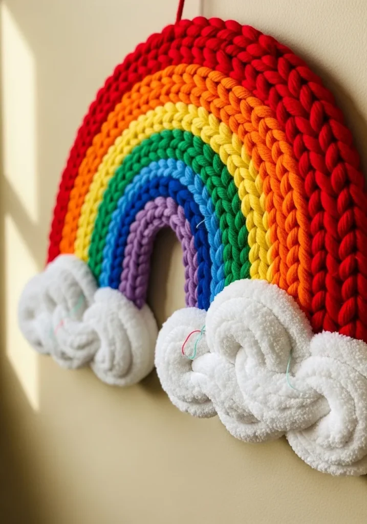 This chunky knit rainbow wall hanging is bursting with bold color, worked in thick strands of red, orange, yellow, green, blue, and purple yarn. Each arc is tightly stitched and slightly raised, giving the rainbow a plush, dimensional look. At the bottom, soft white cloud shapes add a fluffy contrast that makes the colors pop even more. The oversized stitches and gentle yarn fuzz give it that cozy handmade feel, while the curved shape creates a cheerful focal point on the wall.