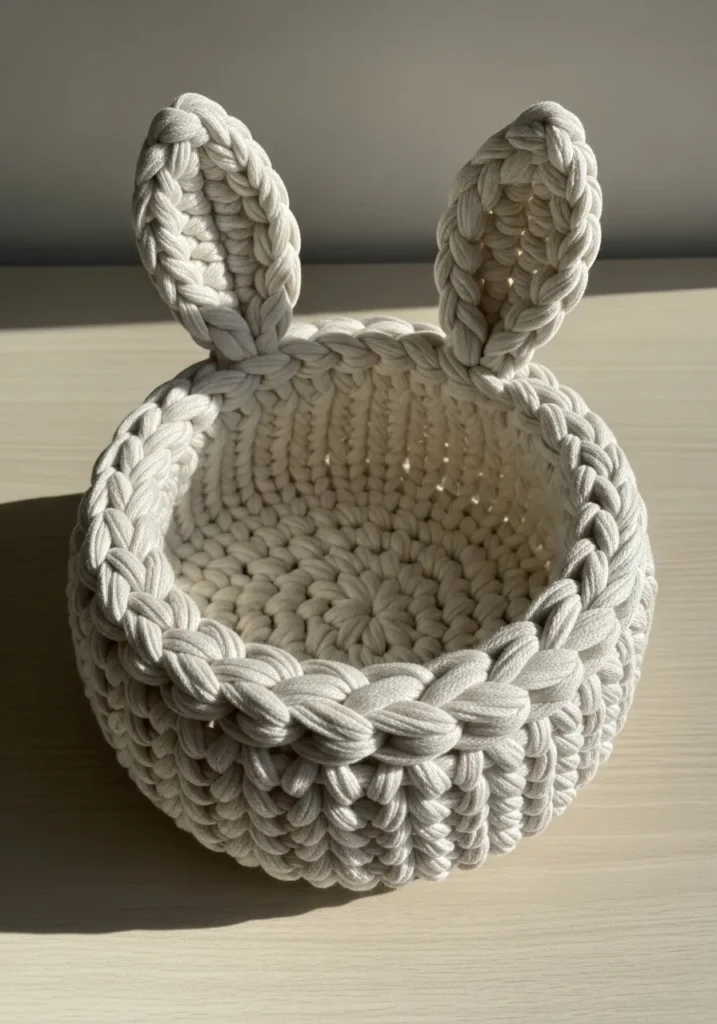 This chunky knit basket is worked in a soft creamy white yarn that gives it a clean and cozy look. The thick stitches create a sturdy round base and structured sides, while the braided rim adds a beautiful finishing detail. Two tall bunny ears rise from the back, shaped with the same plush yarn and slightly curved for extra charm. The texture is bold and defined, with that lovely squishy feel that only chunky yarn can give.