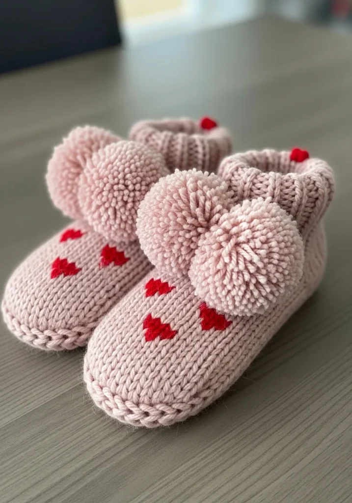 These chunky knit slippers are made from soft blush pink yarn with bold red heart motifs stitched across the top. The shape is cozy and rounded, with a ribbed cuff that hugs the ankle comfortably. On the front of each slipper sits an oversized fluffy pom pom that adds extra texture and playful volume. The thick stitches are plush and slightly fuzzy, giving the slippers that irresistible handmade warmth that chunky yarn does so well.