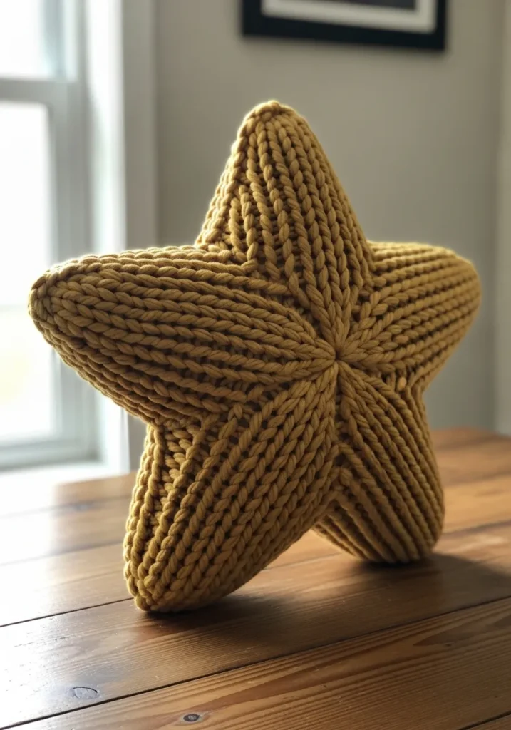 This chunky knit star pillow is worked in a warm golden brown yarn that gives it a cozy, rustic feel. The five pointed shape is fully sculpted, with thick raised stitches radiating from the center to each tip. The chunky yarn creates deep ridges and bold texture, making the star look plush and dimensional from every angle. The slightly fuzzy finish adds softness, while the firm stuffing helps it hold its crisp star silhouette beautifully.