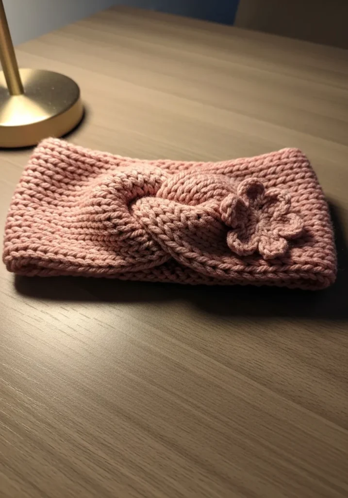 This chunky knit headband is made from thick dusty rose yarn and features a bold twisted front that creates a soft knot effect in the center. The stitches are plush and slightly textured, giving the fabric a cozy, squishy feel. On one side, a small knitted flower is stitched on for a sweet decorative touch that adds charm without overwhelming the design. The yarn has a gentle halo and slight stitch variations that make it feel warm and beautifully handmade.