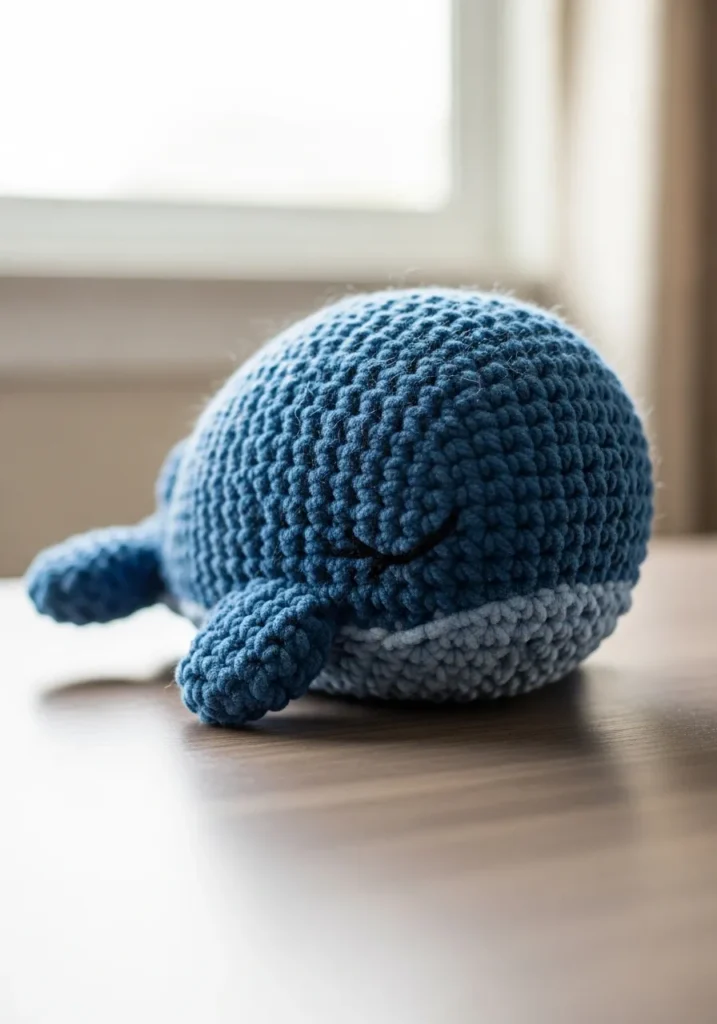 This chunky knit whale plush is made from thick deep blue yarn with a soft lighter blue belly for contrast. The stitches are tight and rounded, giving the whale a smooth, squishy shape that feels extra cuddly. Tiny side fins and a short tail are neatly attached, and a simple stitched sleepy eye adds the sweetest personality. The yarn has a velvety texture with a gentle halo that makes the whole piece look cozy and inviting.