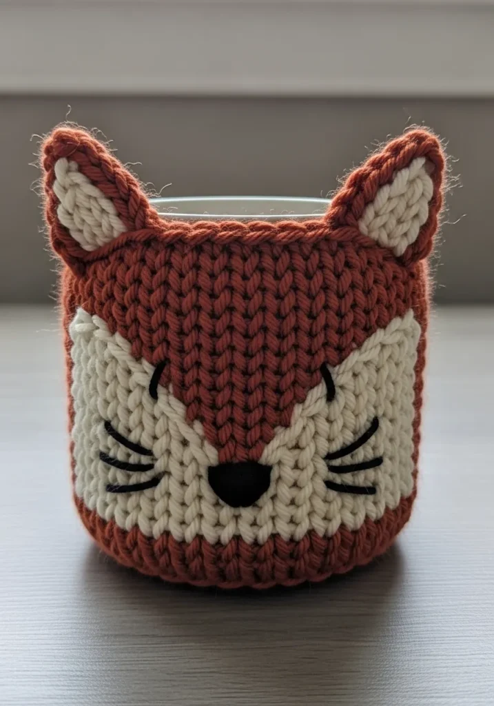 This chunky knit mug cozy is shaped like an adorable fox face, made from rich rust colored yarn with creamy white accents for the cheeks and inner ears. The stitches are thick and defined, giving the cozy a plush, textured look that hugs the mug snugly. Small black stitched details form sleepy eyes, whiskers, and a tiny nose that bring the fox to life. The chunky yarn adds a soft, slightly fuzzy finish that feels warm and handmade in the sweetest way.