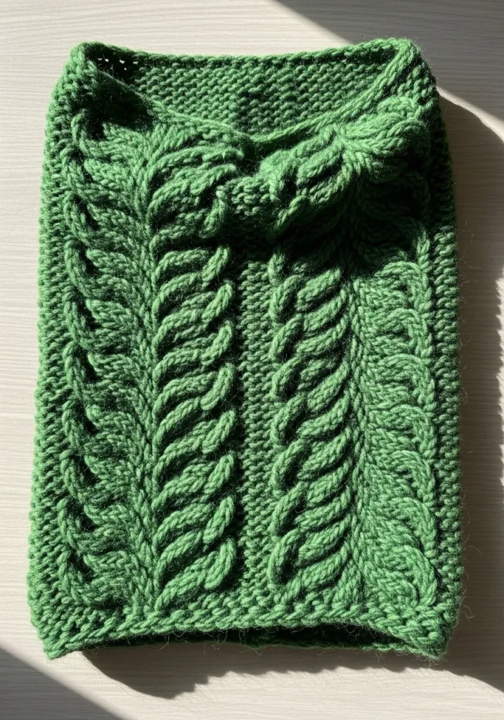 This chunky knit cowl is worked in a rich forest green yarn that instantly brings cozy woodland vibes. The design features bold cable stitches that twist into a leafy pattern down the front, creating beautiful raised texture against a soft garter stitch background. The thick yarn makes every stitch stand out, with a slightly fuzzy halo that adds warmth and depth. The rectangular shape folds naturally into a snug neck wrap, giving it both structure and softness.