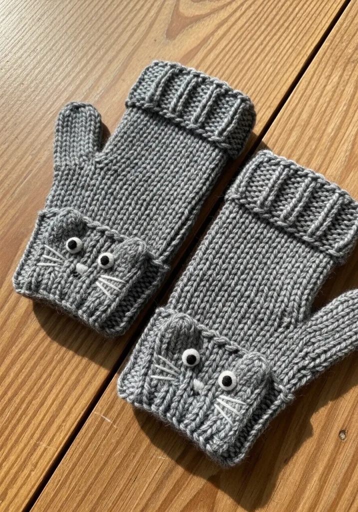 These chunky knit mittens are made from soft gray yarn with a cozy ribbed cuff and smooth stockinette body. The real charm is on the folded cuff where a sweet little cat face is stitched in, complete with round button eyes, tiny whiskers, and a petite nose. The thick yarn gives the mittens a plush feel and beautiful stitch definition, while the slight fuzziness adds to that warm handmade look. The shape is classic and comfortable, but the playful detail makes them stand out in the cutest way.