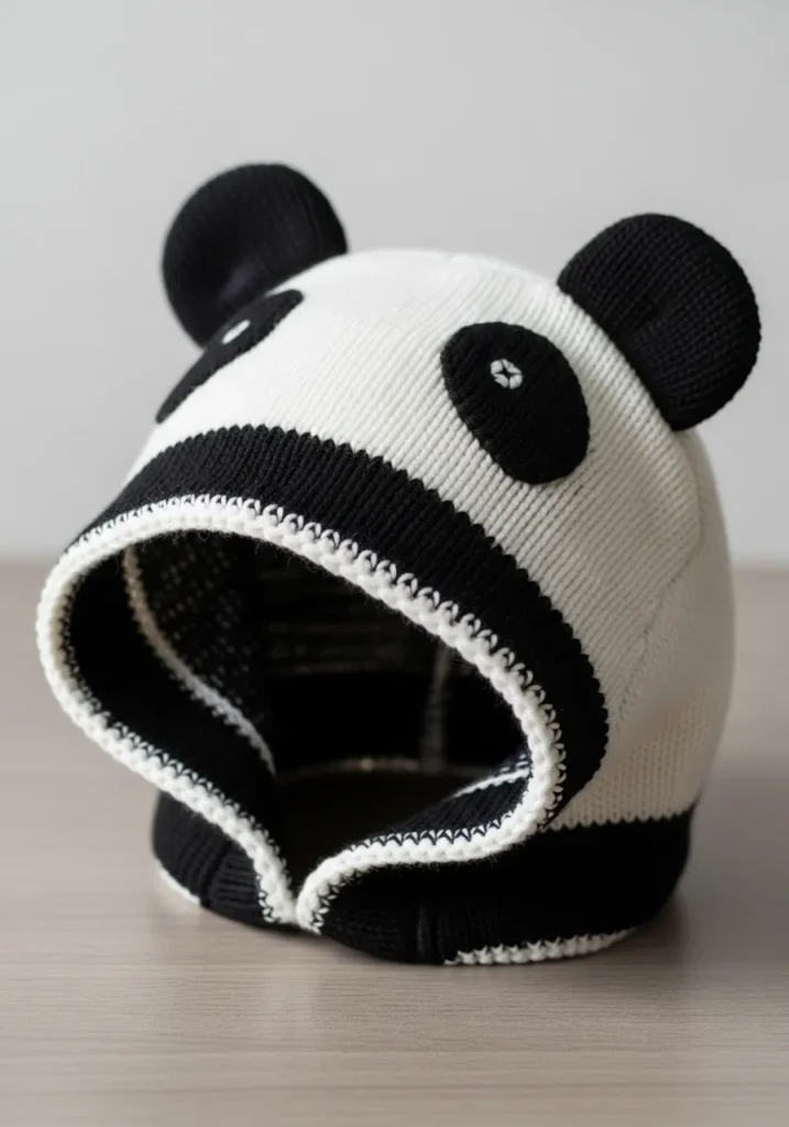 This cozy knitted hood is designed to look just like a sweet little panda, with bold black and white color blocking that instantly catches the eye. The soft white base is framed with a deep black ribbed edge, while two round knitted ears sit neatly on top. Black oval eye patches are stitched onto the front, giving it that unmistakable panda expression. The yarn appears smooth and snug, creating a clean finish that feels warm and comfortable.