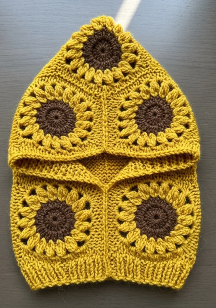 This cozy knitted hood is bursting with cheerful sunflower motifs in golden yellow and deep chocolate brown. Each flower is worked into square panels that come together to form a beautifully structured hood and matching cowl. The textured petals pop against the smooth knit background, giving the design depth and a slightly raised feel. A ribbed hem at the bottom adds stretch and polish, while the warm mustard tone makes the whole piece glow like late summer sunshine.