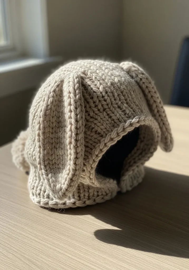 This cozy knitted hood is the definition of soft and snuggly, worked in a creamy beige yarn with a chunky ribbed texture that adds depth and warmth. The hood features two long floppy bunny ears that drape gently down the sides, giving it an irresistibly sweet look. The stitches are bold and slightly raised, which makes the structure feel sturdy yet plush. A wide ribbed edge frames the face and continues into the neck area for extra coziness.