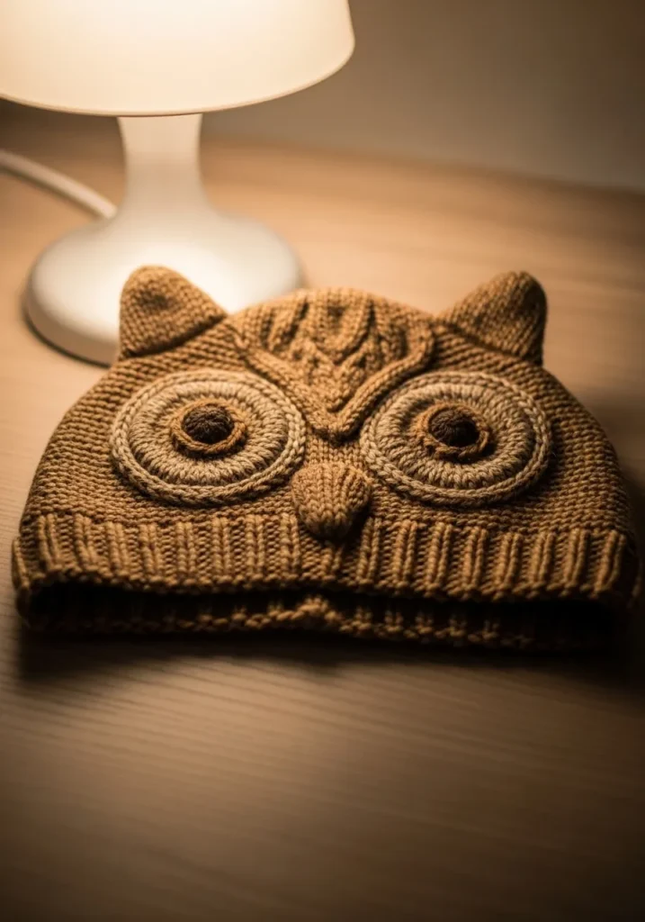 This cozy knitted hood is shaped into the most charming owl face, worked in warm caramel brown yarn with rich textured stitches. The standout feature is the pair of oversized circular eyes, layered in lighter and darker shades to create depth and personality. A small pointed beak sits neatly in the center, and subtle raised stitch details above the eyes give it that wise expressive look. The ribbed brim along the bottom adds structure while keeping the fit snug and comfortable.