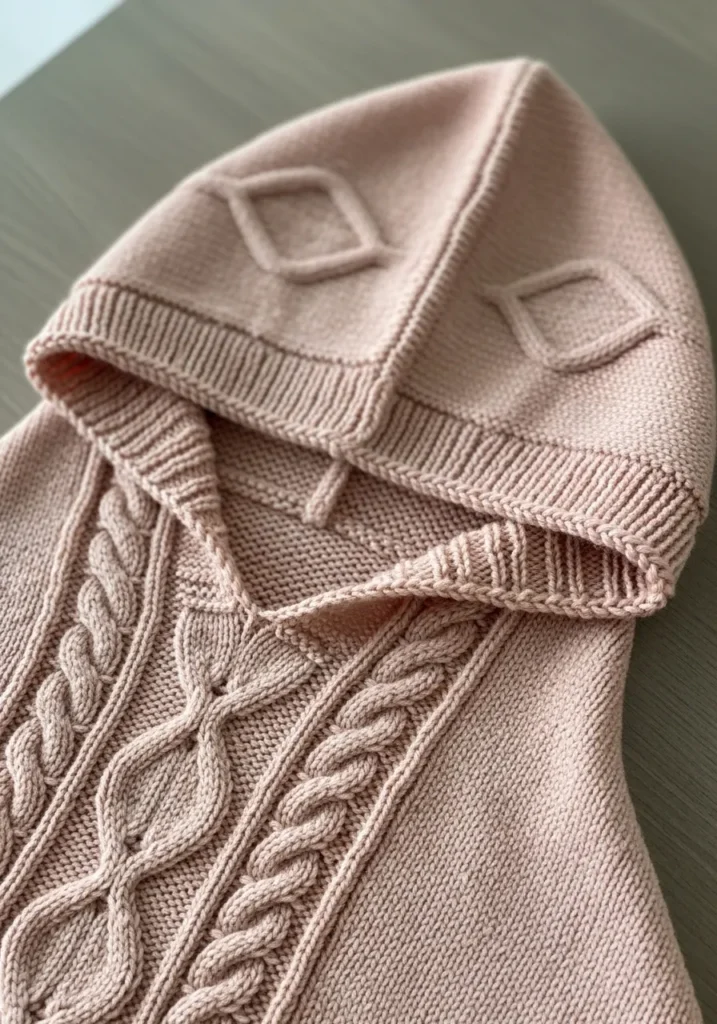 This cozy knitted hood is worked in a soft blush pink yarn that gives it a gentle and elegant feel. The body features beautifully defined cable panels that run vertically, paired with smooth knit sections for balance. The hood itself has a structured ribbed edge and two subtle raised diamond accents on top that add a modern geometric touch. The texture looks plush and warm, with clean lines that make the overall design feel polished yet still wonderfully handmade.