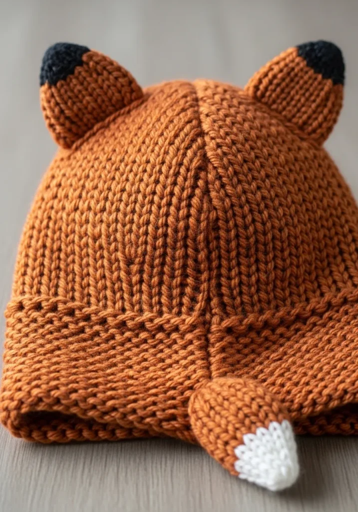 This cozy knitted hood is inspired by a sweet little fox, complete with pointed ears in warm rust yarn and tiny black tips that make them pop. The body is worked in a rich burnt orange shade with a beautifully defined ribbed texture that adds structure and warmth. At the back, a small knitted tail detail with a soft white tip brings the whole woodland look together. The thick folded brim gives it a snug finish, and the overall texture feels soft, chunky, and wonderfully handmade.