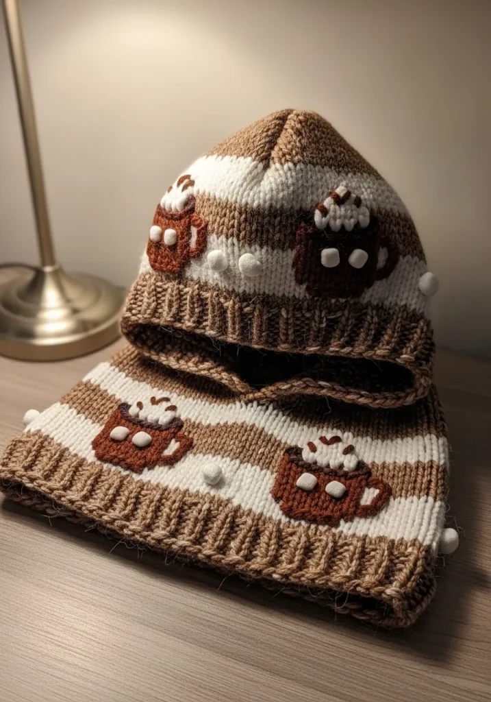This cozy knitted hood is the ultimate winter comfort piece with its warm brown and creamy white stripes. Across the surface, adorable little hot cocoa mugs are stitched in rich chocolate tones, topped with fluffy white marshmallows that add a soft 3D effect. The ribbed brim gives it a snug fit, while the matching cowl wraps around the neck for extra warmth. The yarn looks thick and plush, creating a soft and slightly fuzzy texture that feels perfect for chilly evenings.