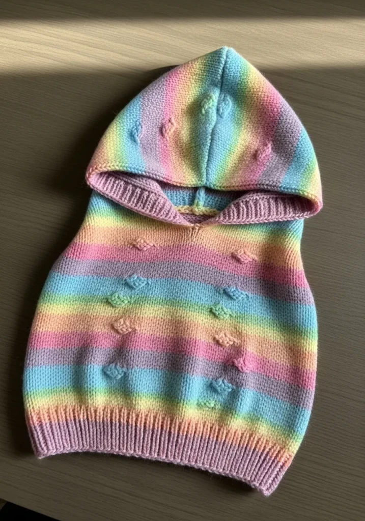 This cozy knitted hood is a soft explosion of pastel rainbow stripes in shades of baby pink, mint green, sky blue, and buttery yellow. The yarn looks smooth and lightweight, giving the hood a gentle drape while still feeling warm. Scattered across the surface are tiny textured heart like stitch details that add a subtle raised effect and extra charm. A ribbed hem in blush pink frames the bottom and face opening, tying the whole sweet color palette together.