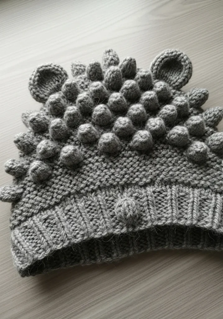 This cozy knitted hood is made in a soft heather grey yarn that gives it a warm and woodland feel. The top is covered in rows of chunky bobble stitches that create a spiky, textured surface, just like a sweet little hedgehog. Tiny rounded ears peek out from the sides, adding an extra playful touch. The lower edge features a ribbed band for stretch and comfort, along with a few simple knit details that keep the design balanced and snug.