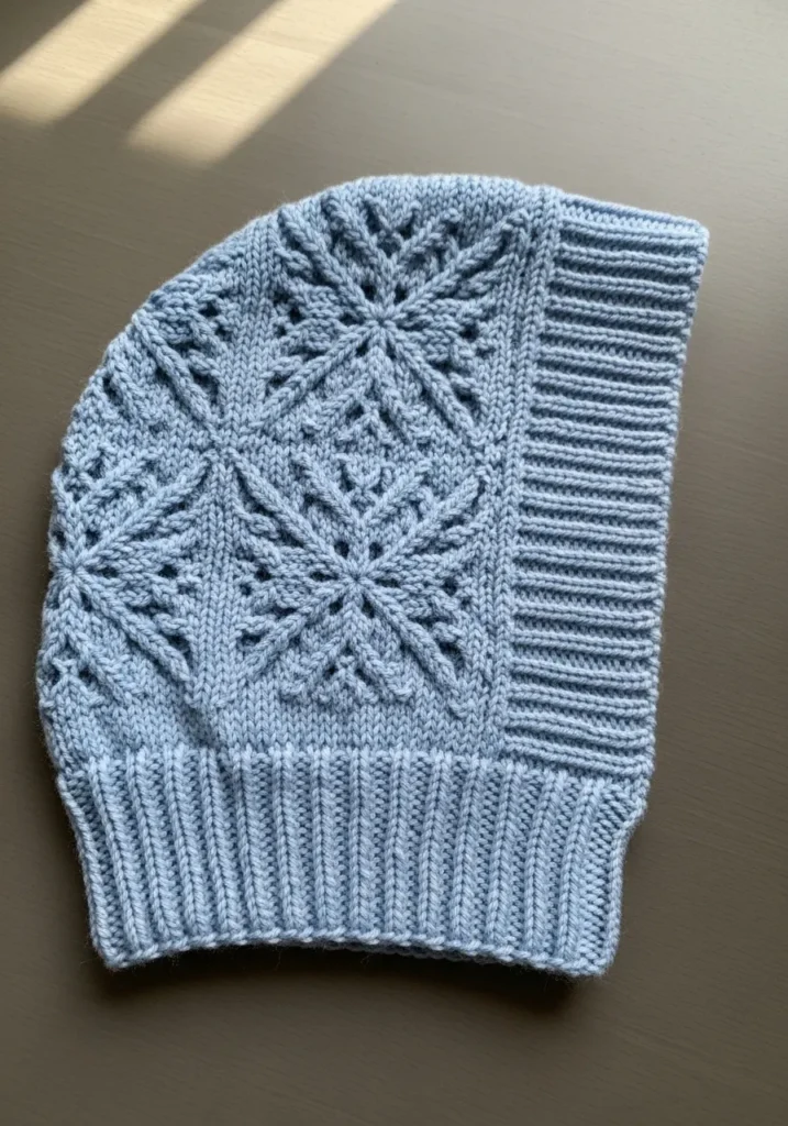 This cozy knitted hood is worked in a soft icy blue yarn that instantly feels calm and wintry. The surface features repeating lace motifs that bloom like delicate snowflakes, creating an airy yet still warm texture. A wide ribbed band frames the face and bottom edge, giving it structure and a snug fit. The contrast between the open lace pattern and the dense ribbing makes the design feel balanced and beautifully detailed.