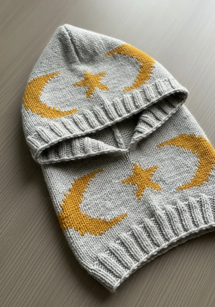 This cozy knitted hood features bold crescent moons and a sweet little star worked in a warm mustard tone against a soft light gray base. The design looks like classic colorwork, neatly stitched into smooth stockinette that feels soft and comfortable. A ribbed brim frames the face beautifully and adds stretch, while the hood shape falls gently with a relaxed, slightly slouchy silhouette. The contrast between the muted gray and golden yellow gives it a dreamy night sky vibe that still feels modern and wearable.