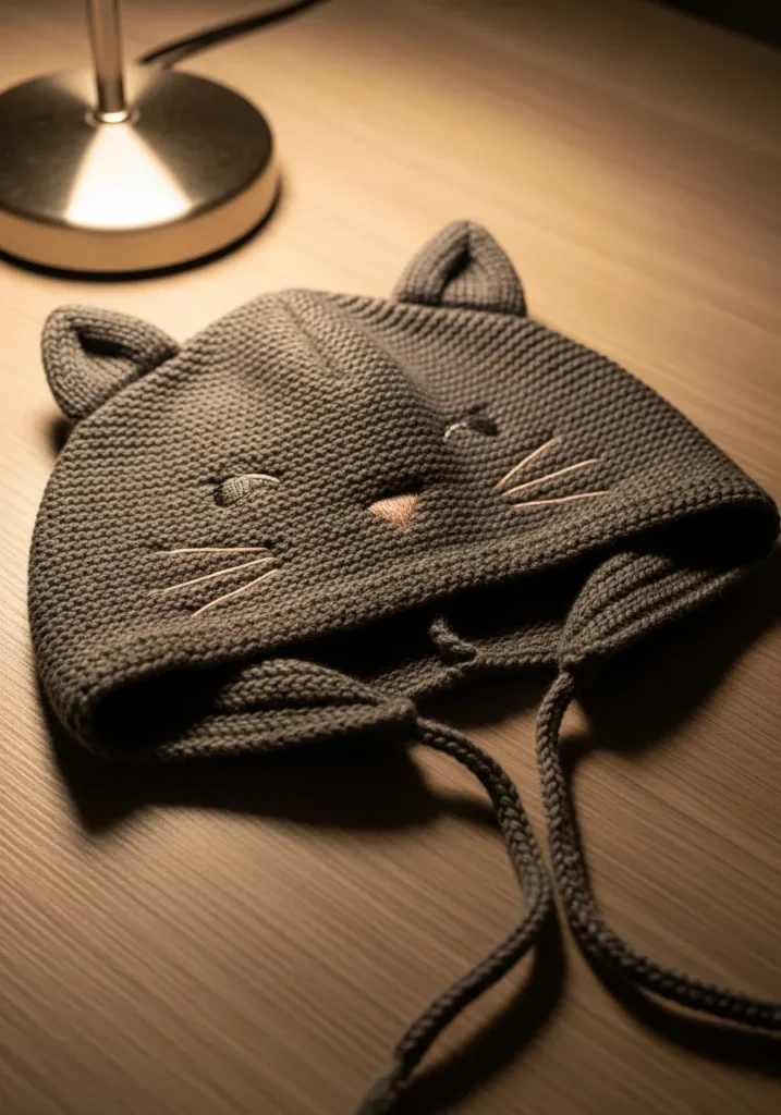 This cozy knitted hood is designed to look like the sweetest sleepy cat, complete with soft pointed ears and delicate stitched whiskers. It is worked in a smooth charcoal gray yarn with a neat textured stitch that gives it a warm, snug feel. The tiny embroidered eyes and blush pink nose add just the right touch of personality without overwhelming the design. Long knitted ties hang from each side, making it easy to secure and adding an extra layer of charm.