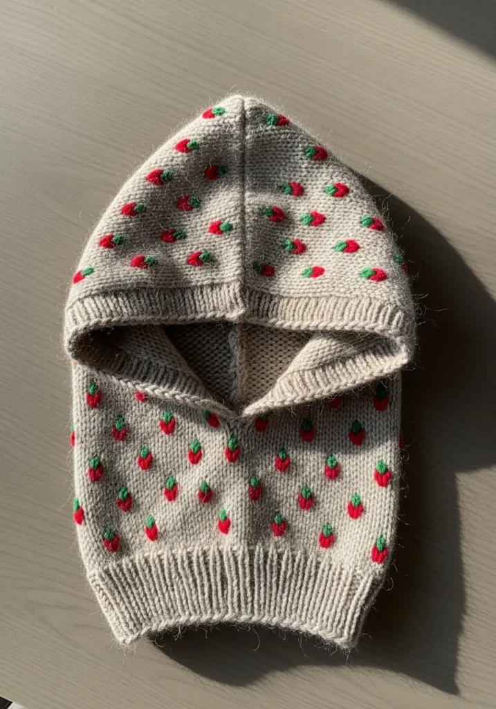 This cozy knitted hood is sprinkled with the cutest tiny strawberry motifs in bright red with little green tops, set against a soft oatmeal colored base. The yarn looks fluffy and warm, with a gentle halo that gives it that perfectly handmade feel. A snug ribbed hem frames the face and finishes the bottom edge, while the smooth knit fabric lets the playful fruit pattern really shine. The matching cowl section makes it feel extra snug and complete, almost like a hooded sweater in miniature form.