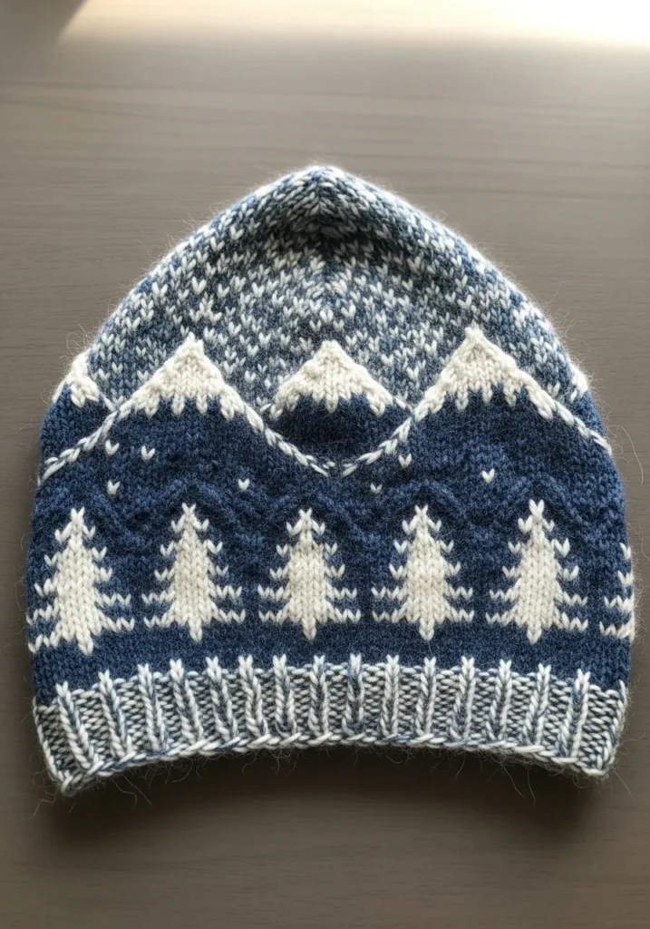 This cozy knitted hood brings serious winter storybook vibes with its deep navy base and crisp white colorwork. Snow capped mountains stretch across the top, while rows of tiny pine trees line the middle in a charming forest scene. The soft yarn has a gentle halo that adds warmth and texture, and the ribbed brim at the bottom gives it structure and stretch. The overall shape is classic and snug, making the detailed pattern the true star of the design.